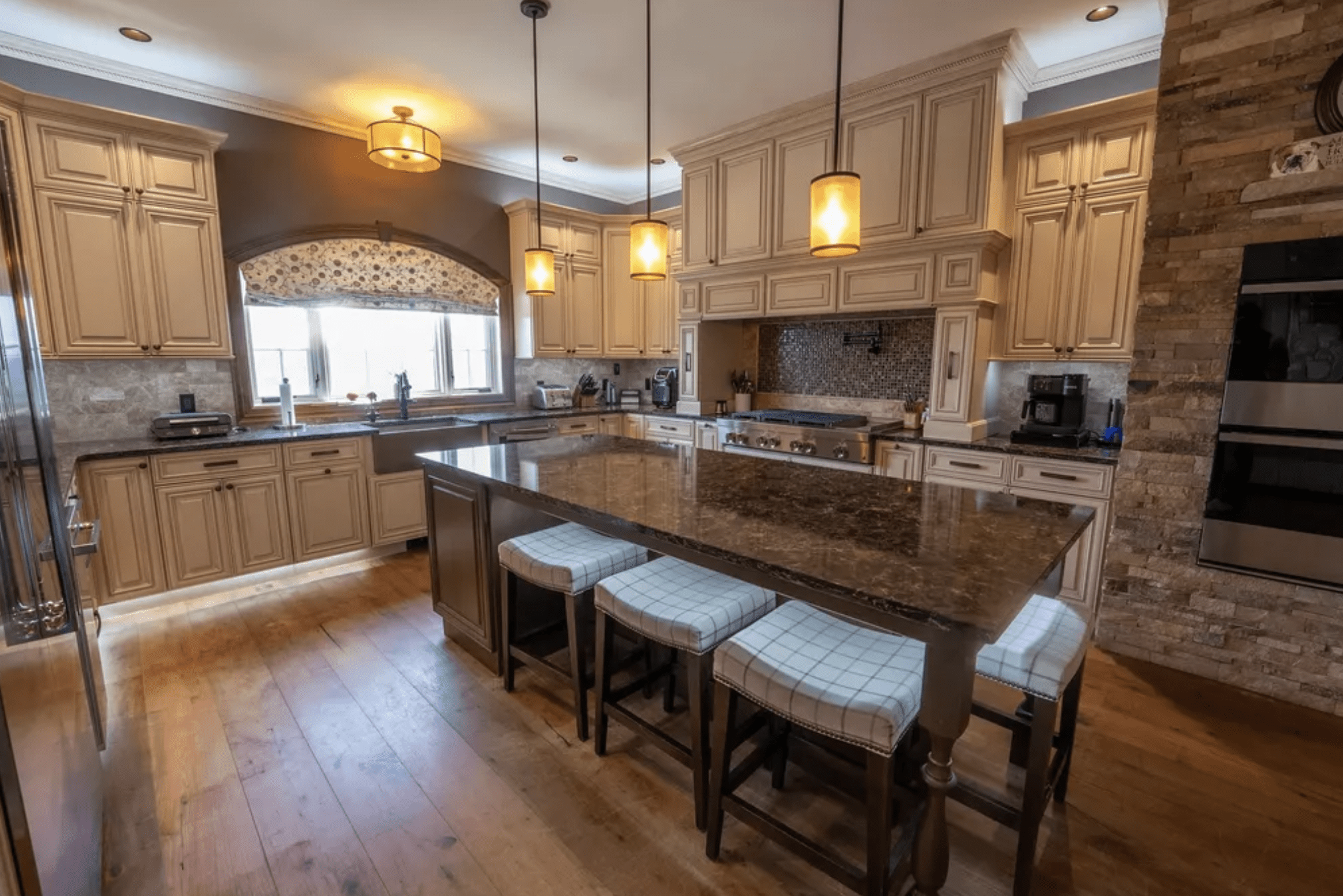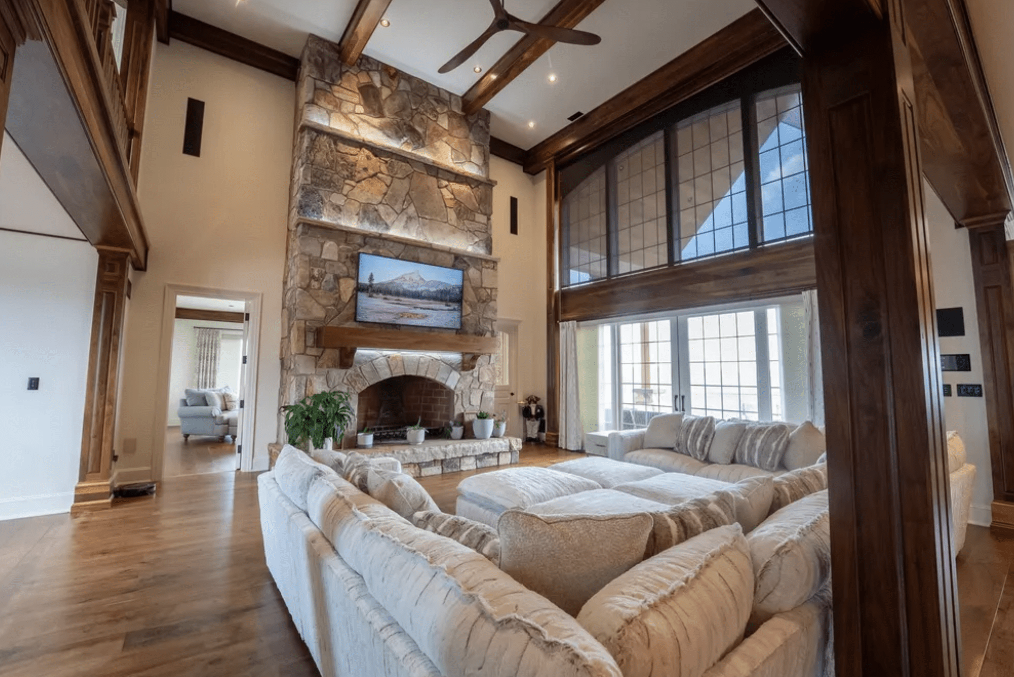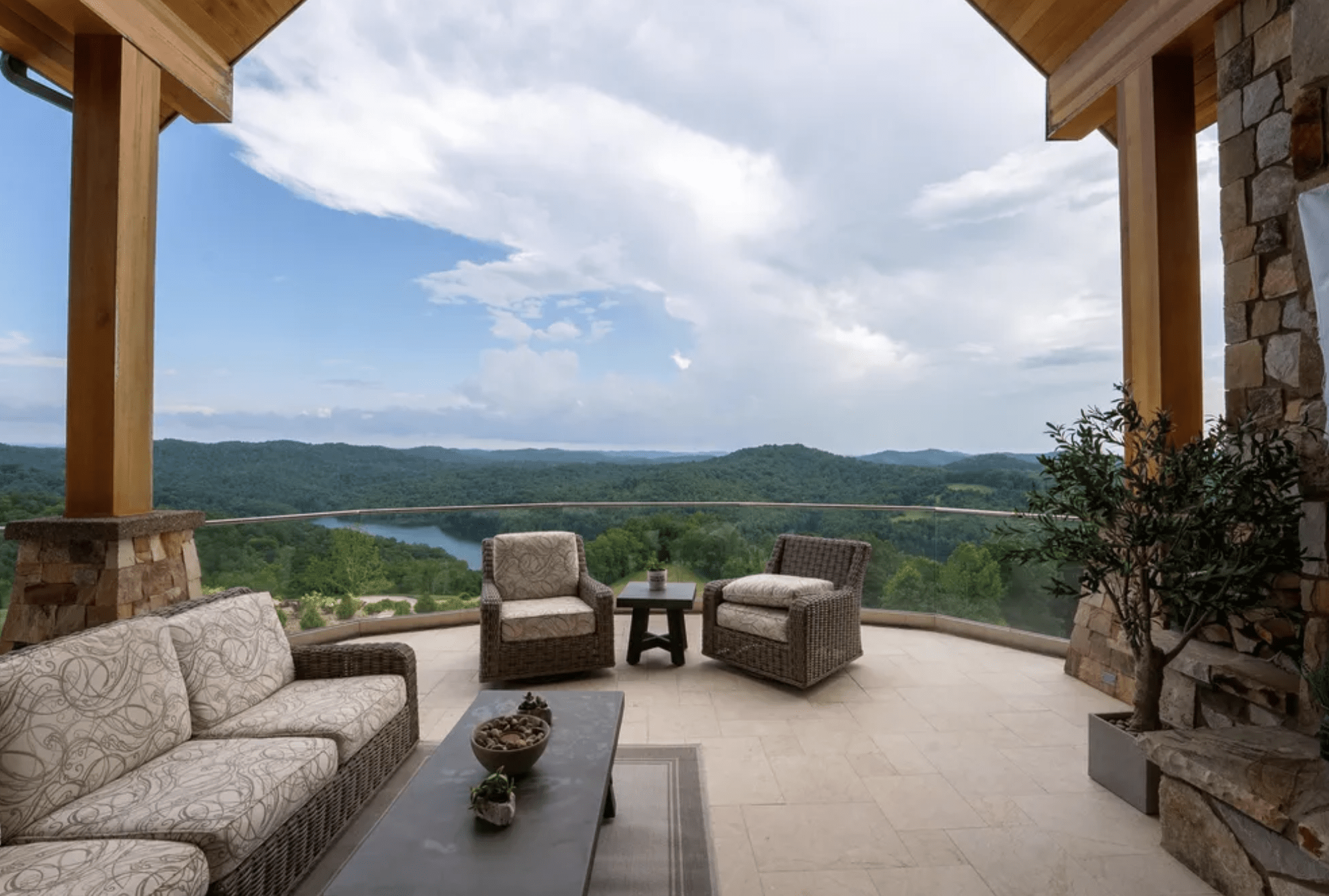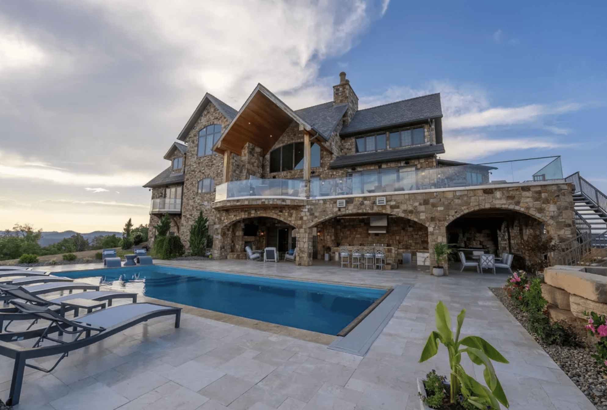This 150+ acre estate is located at 300 Mountain Retreat Drive in Horner, West Virginia. The stone home features over 10,000 square feet of living space with 7 bedrooms, 7 full and 2 half bathrooms, living & dining rooms, great room, kitchen, lower level family room with wet bar, 3-car garage and more. There is also a 40×80 workshop.