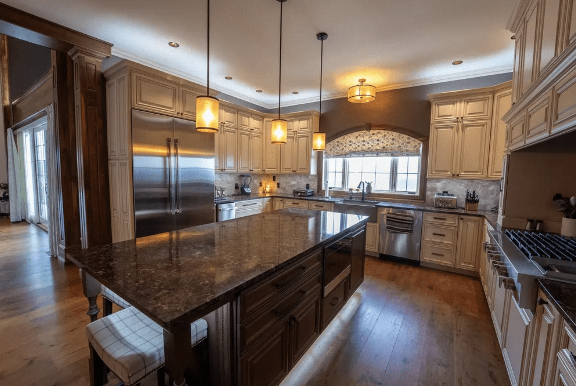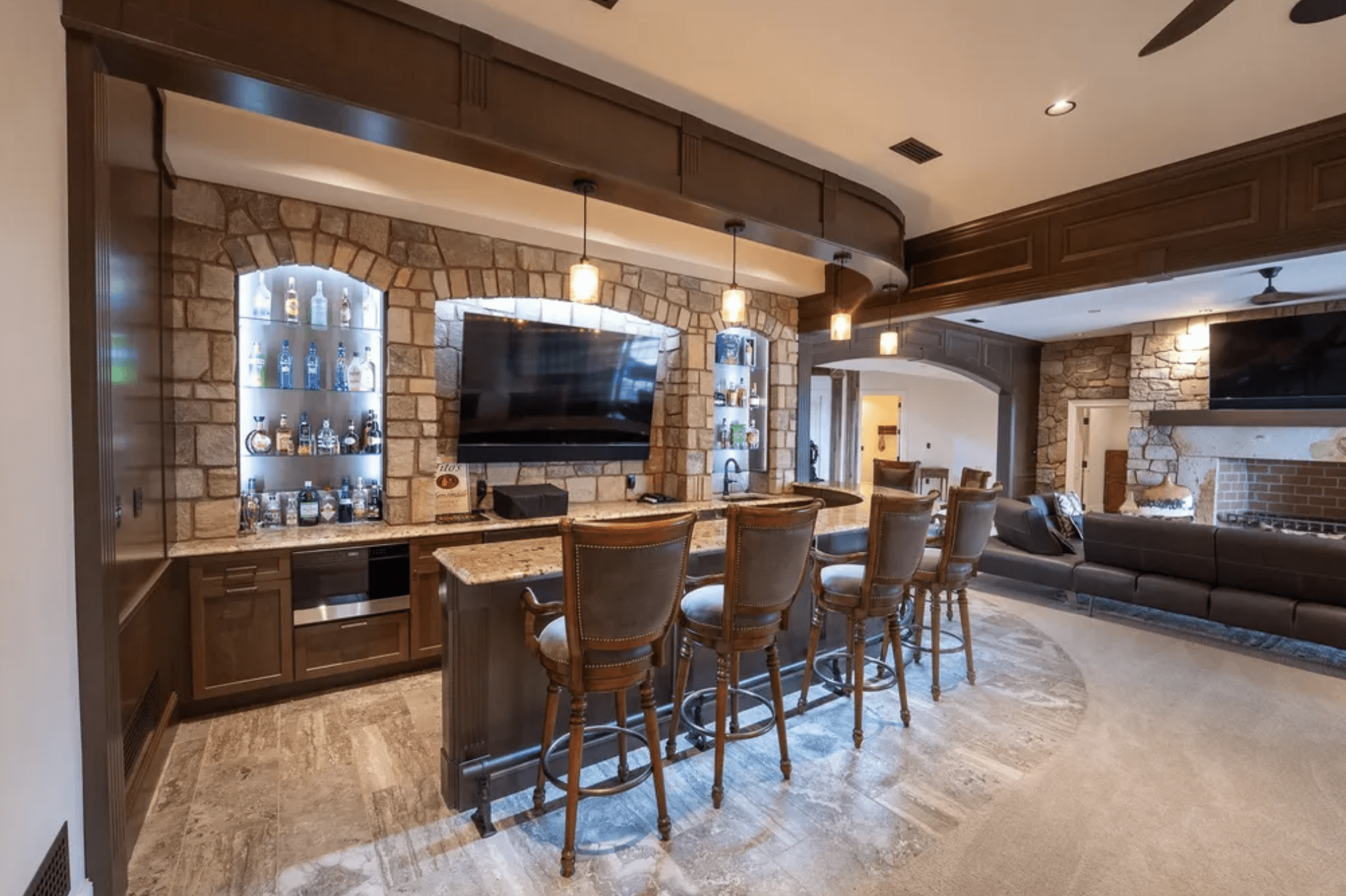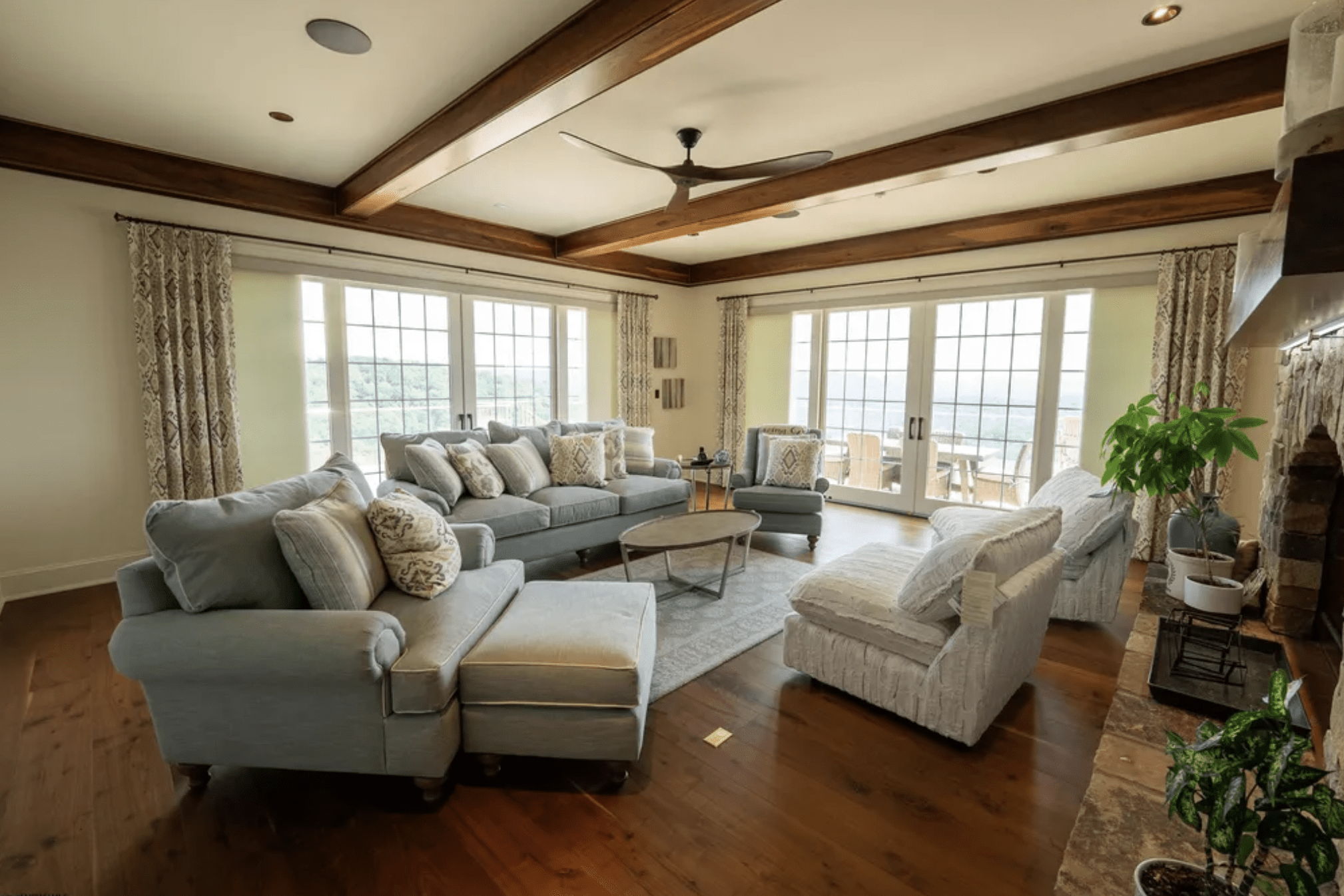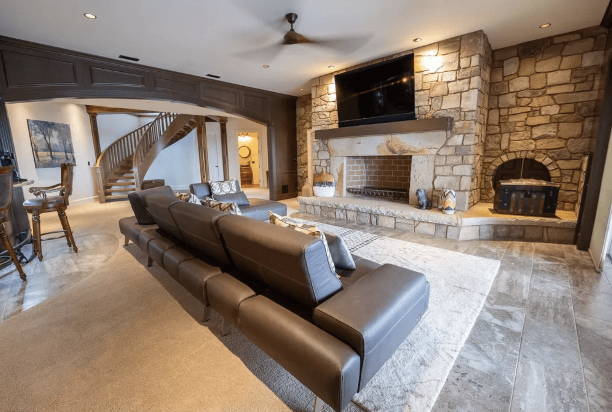 This 150+ acre estate is located at 300 Mountain Retreat Drive in Horner, West Virginia. The stone home features over 10,000 square feet of living space with 7 bedrooms, 7 full and 2 half bathrooms, living & dining rooms, great room, kitchen, lower level family room with wet bar, 3-car garage and more. There is also a 40×80 workshop.