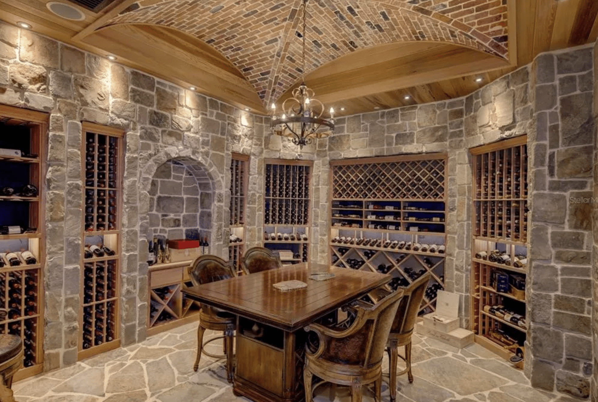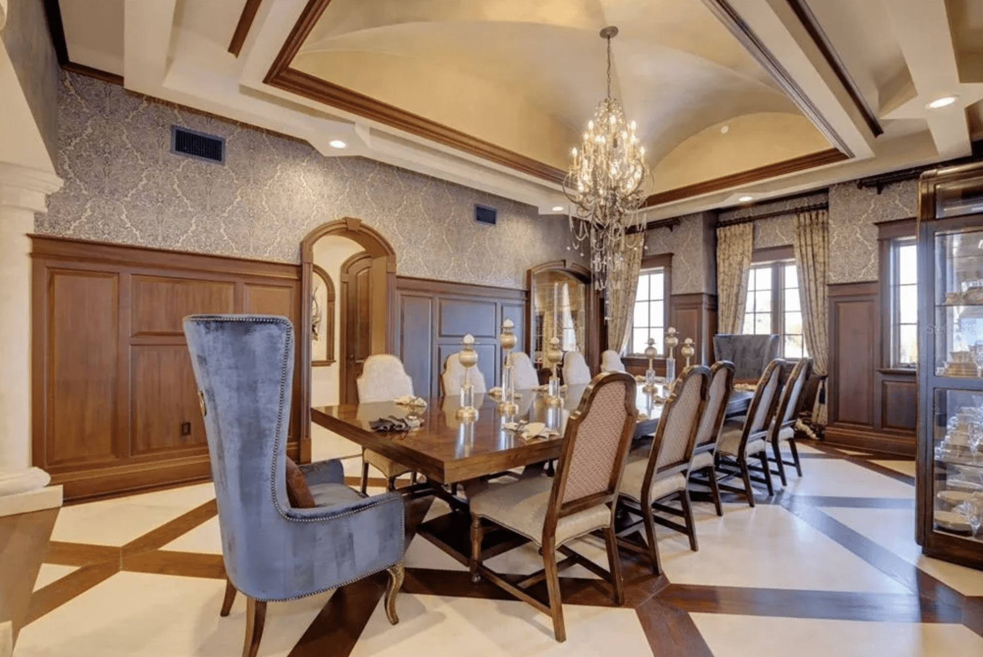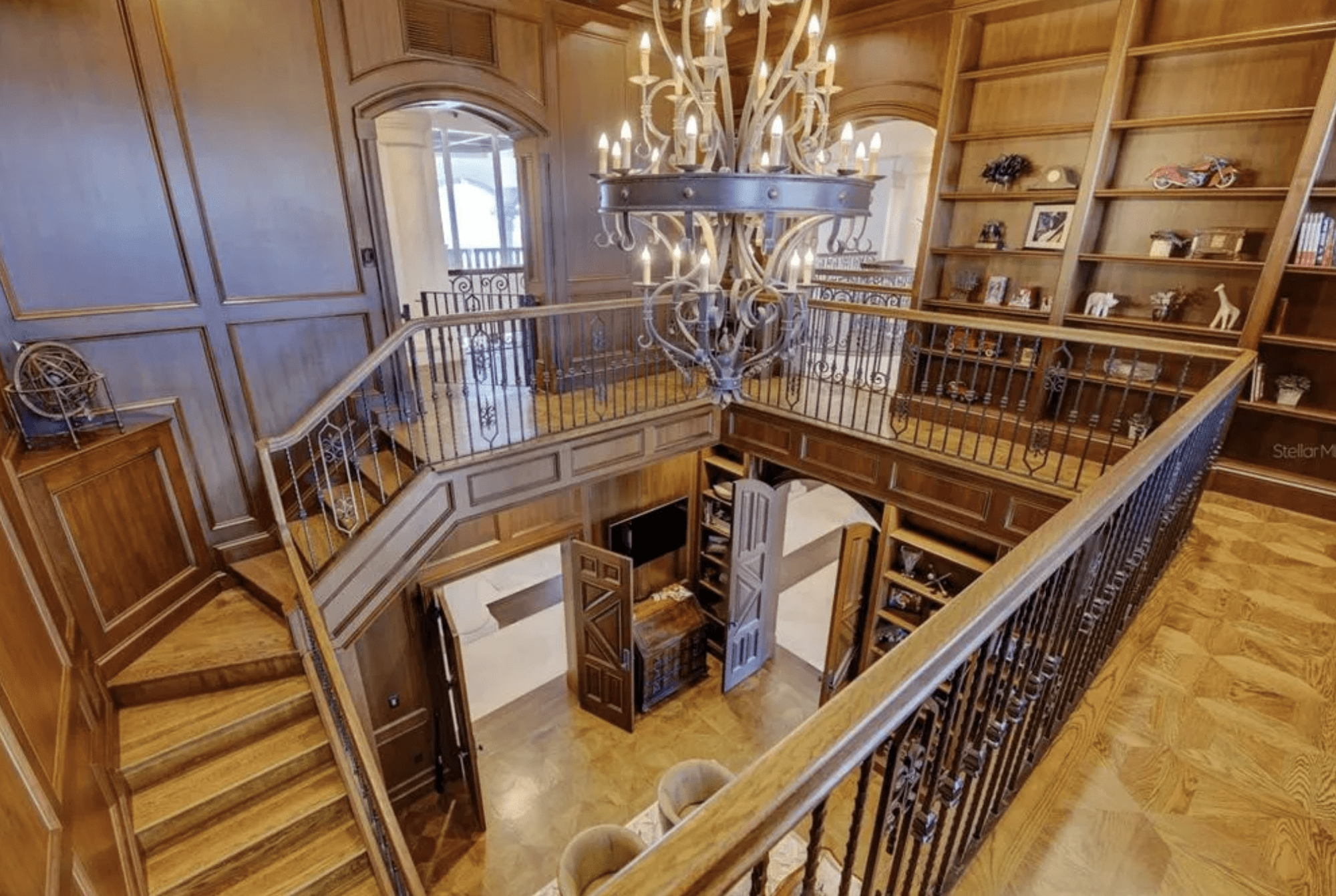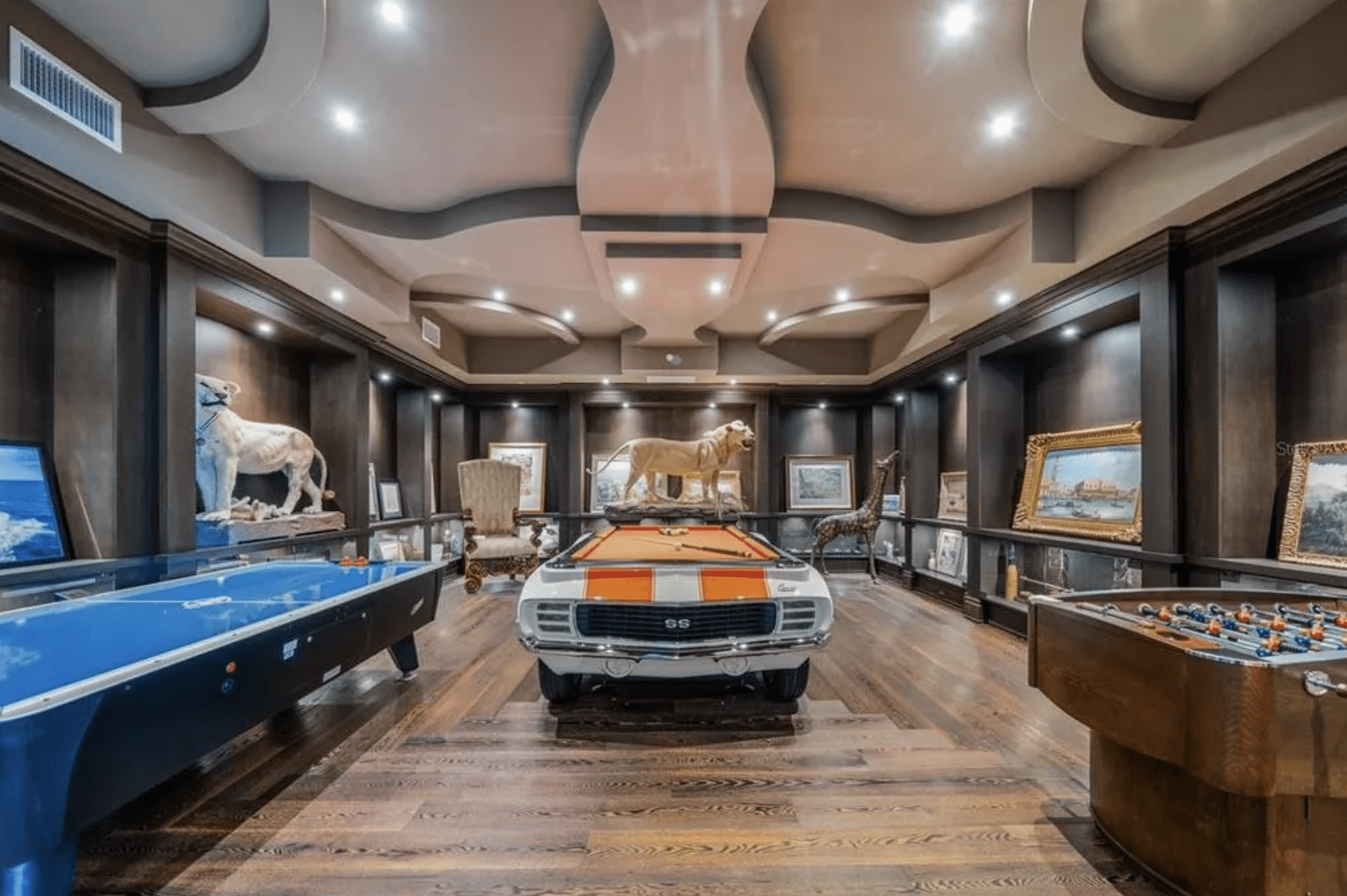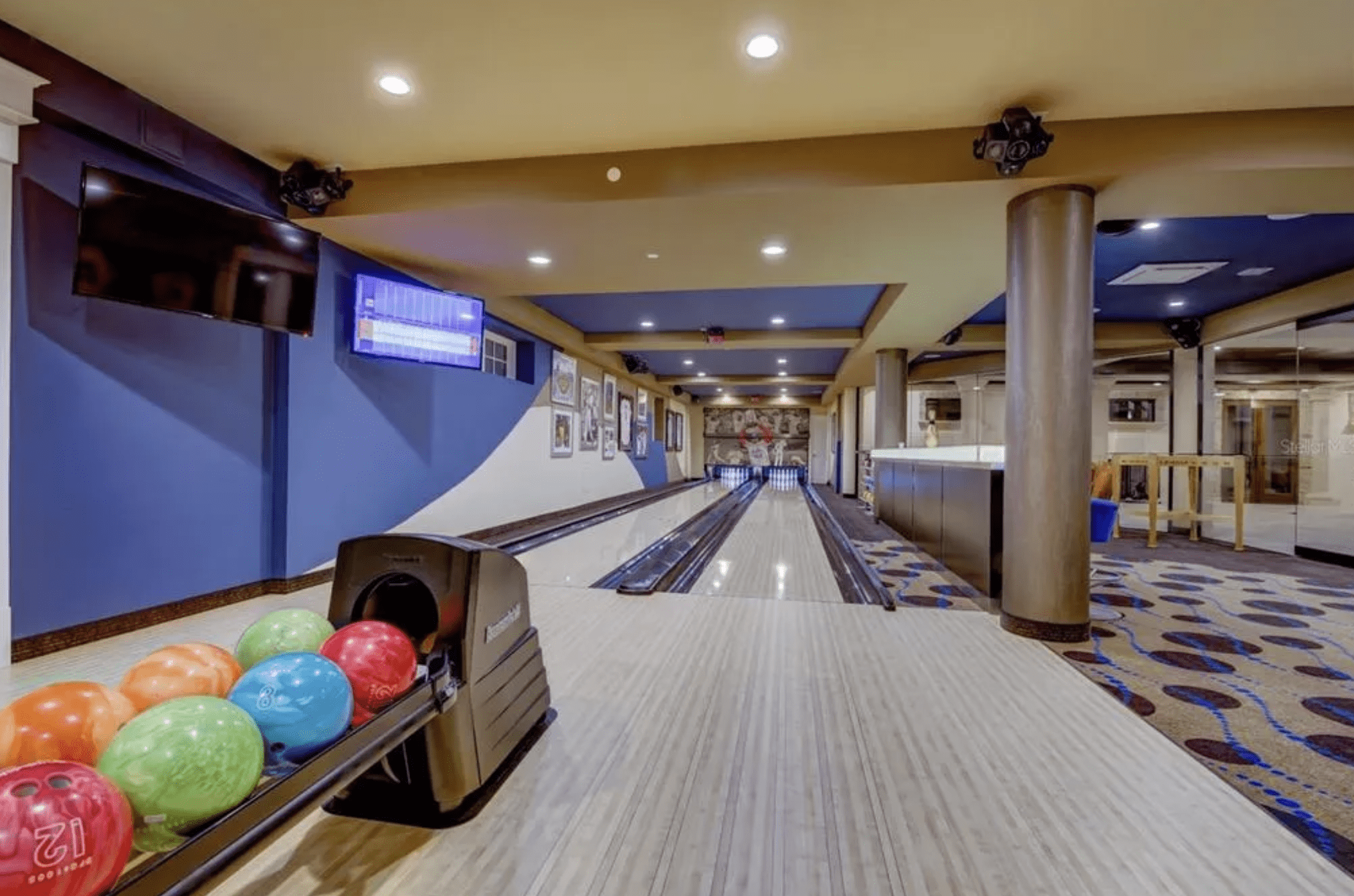 It consists of a Mediterranean-style main house and attached guest house. There are a total of 10 bedrooms & 11 full & 3 half bathrooms. The main house features over 19,000 square feet of living space with an elevator, great room, formal dining room, kitchen, 2-story office/library, wet bar, game room, movie theater, gym, bowling alley and more. The guest house features over 5,000 square feet of living space. There is also garage space for 7 cars.