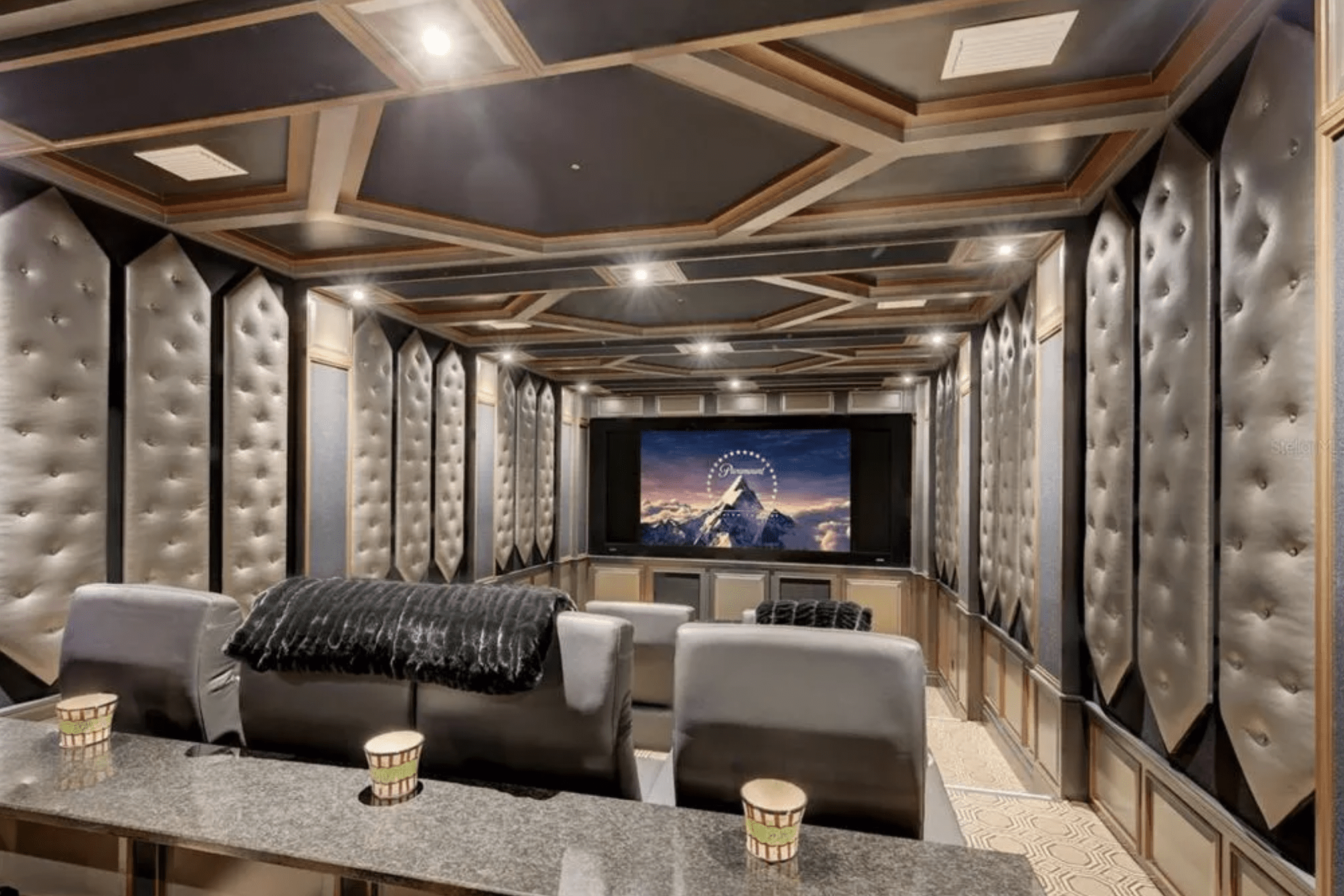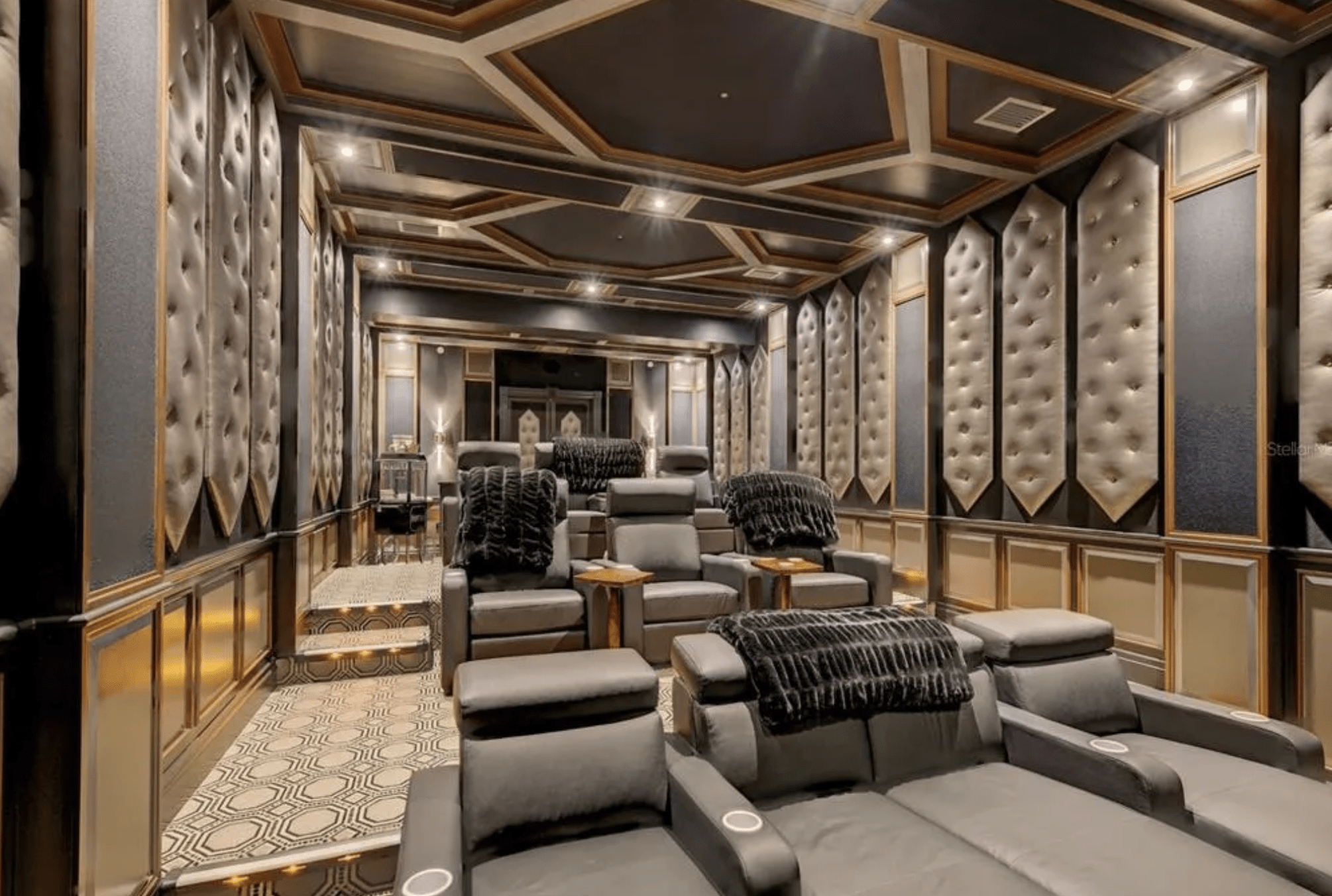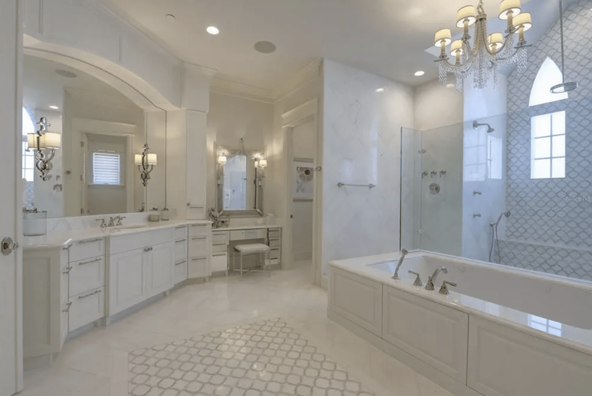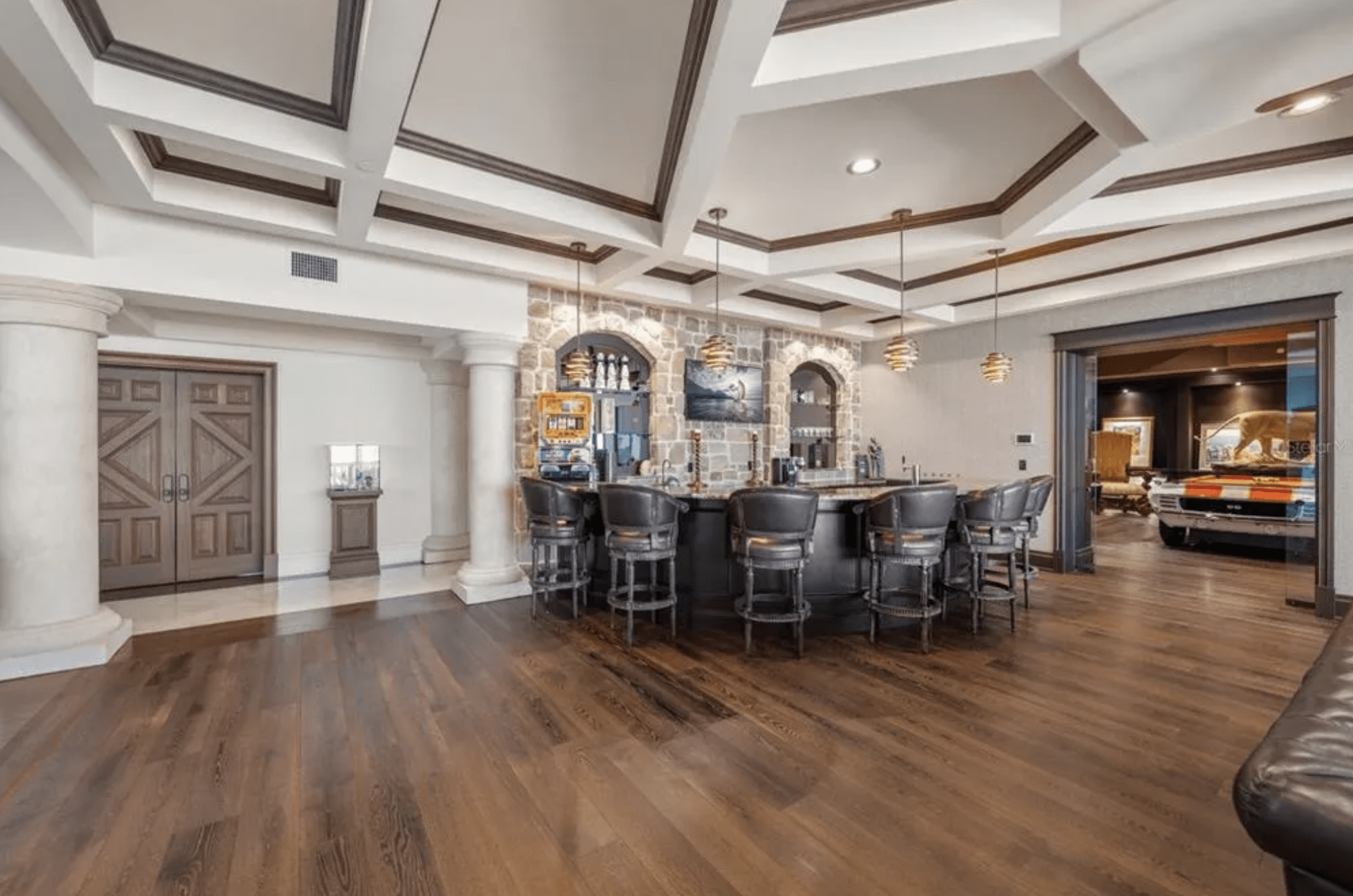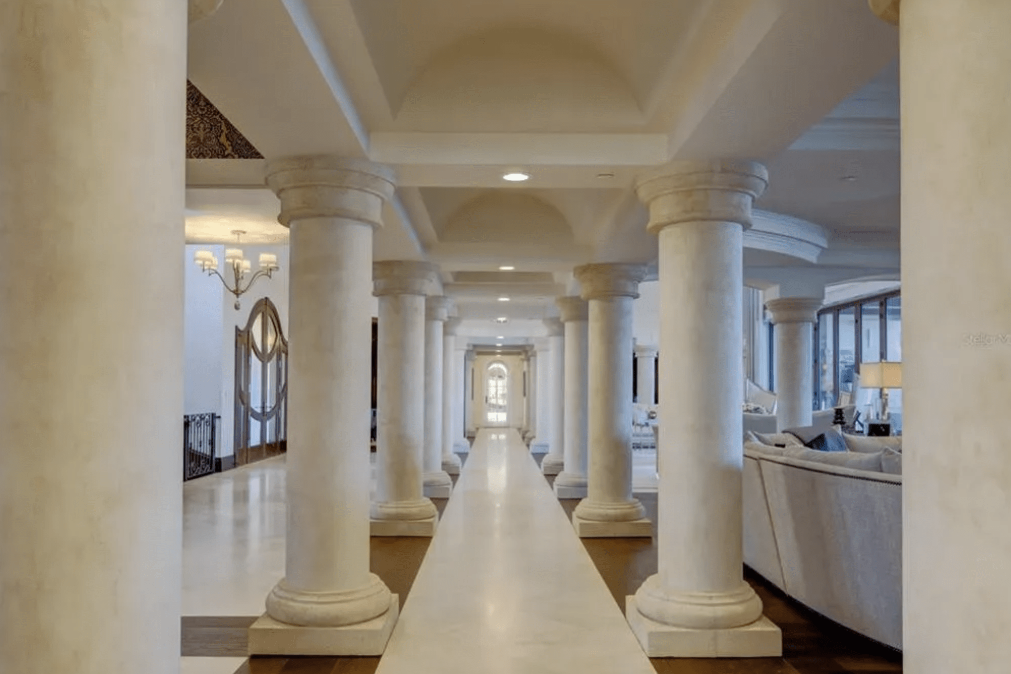 It consists of a Mediterranean-style main house and attached guest house. There are a total of 10 bedrooms & 11 full & 3 half bathrooms. The main house features over 19,000 square feet of living space with an elevator, great room, formal dining room, kitchen, 2-story office/library, wet bar, game room, movie theater, gym, bowling alley and more. The guest house features over 5,000 square feet of living space. There is also garage space for 7 cars.