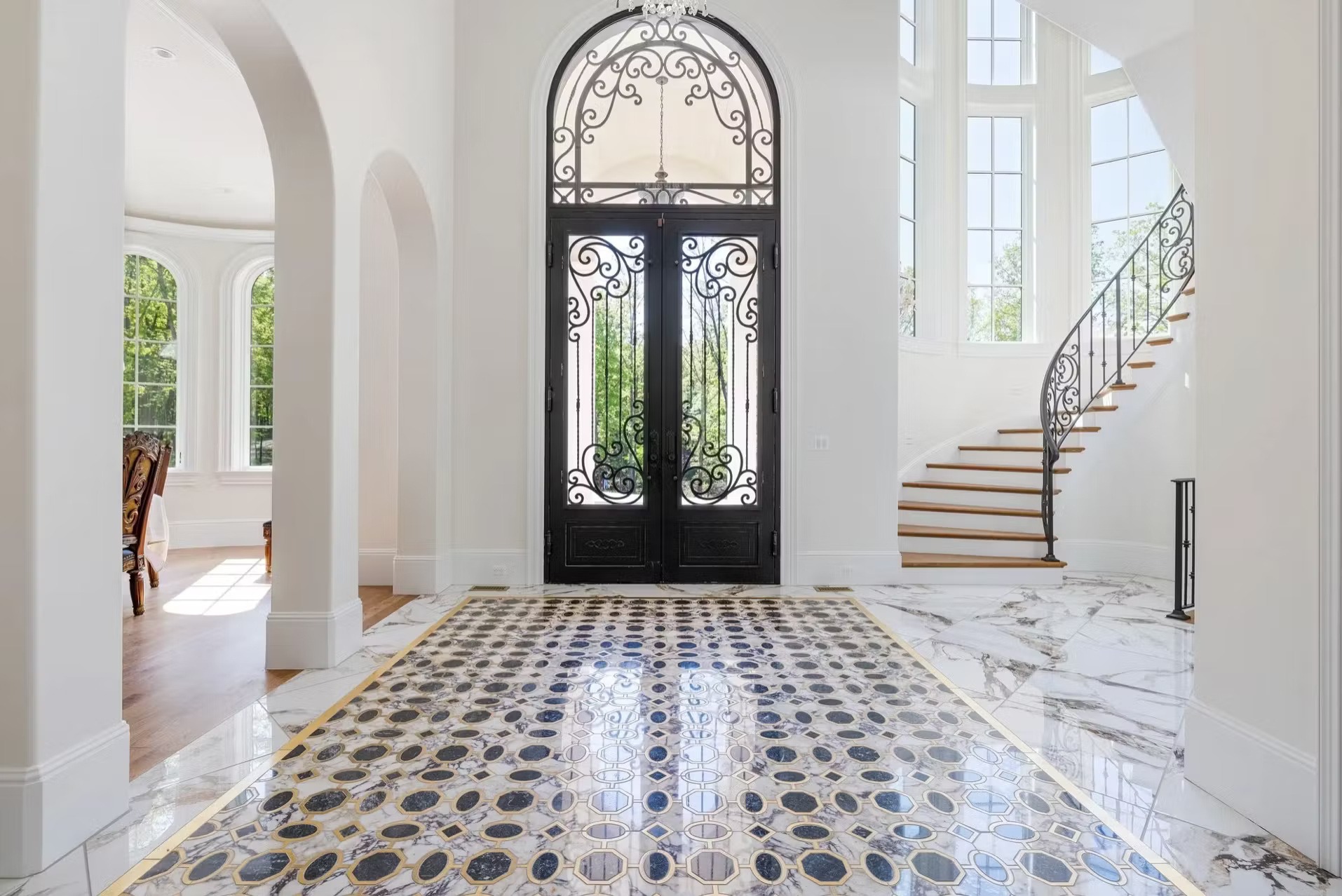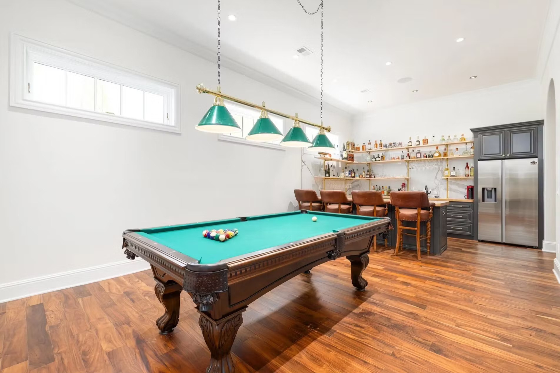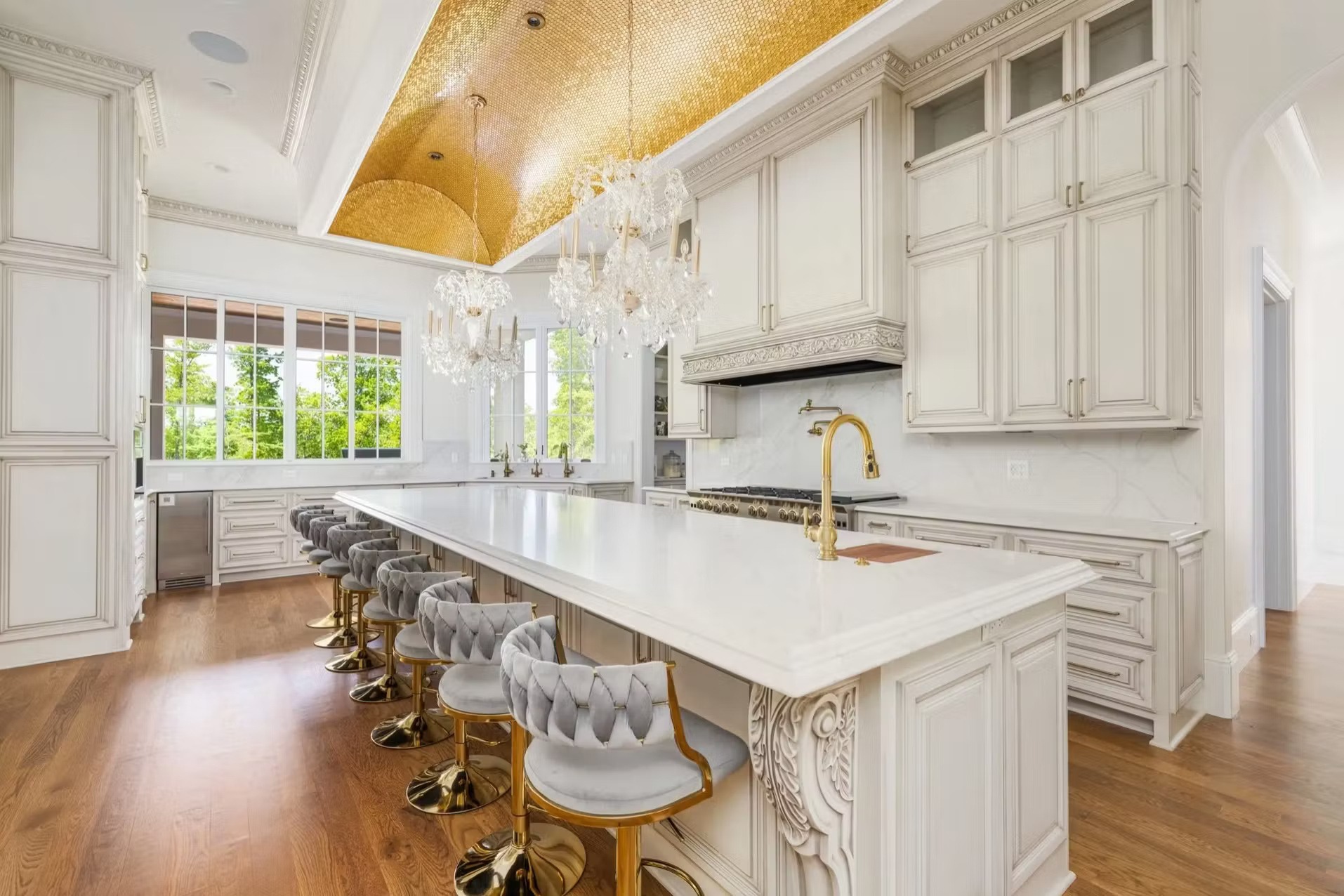 It features over 14,000 square feet of living space with 5 bedrooms, 7 full and 3 half bathrooms, elevator, living & dining rooms, kitchen, pantry, billiards room with wet bar, movie theater, wine cellar, gym, 5-car garage and more.