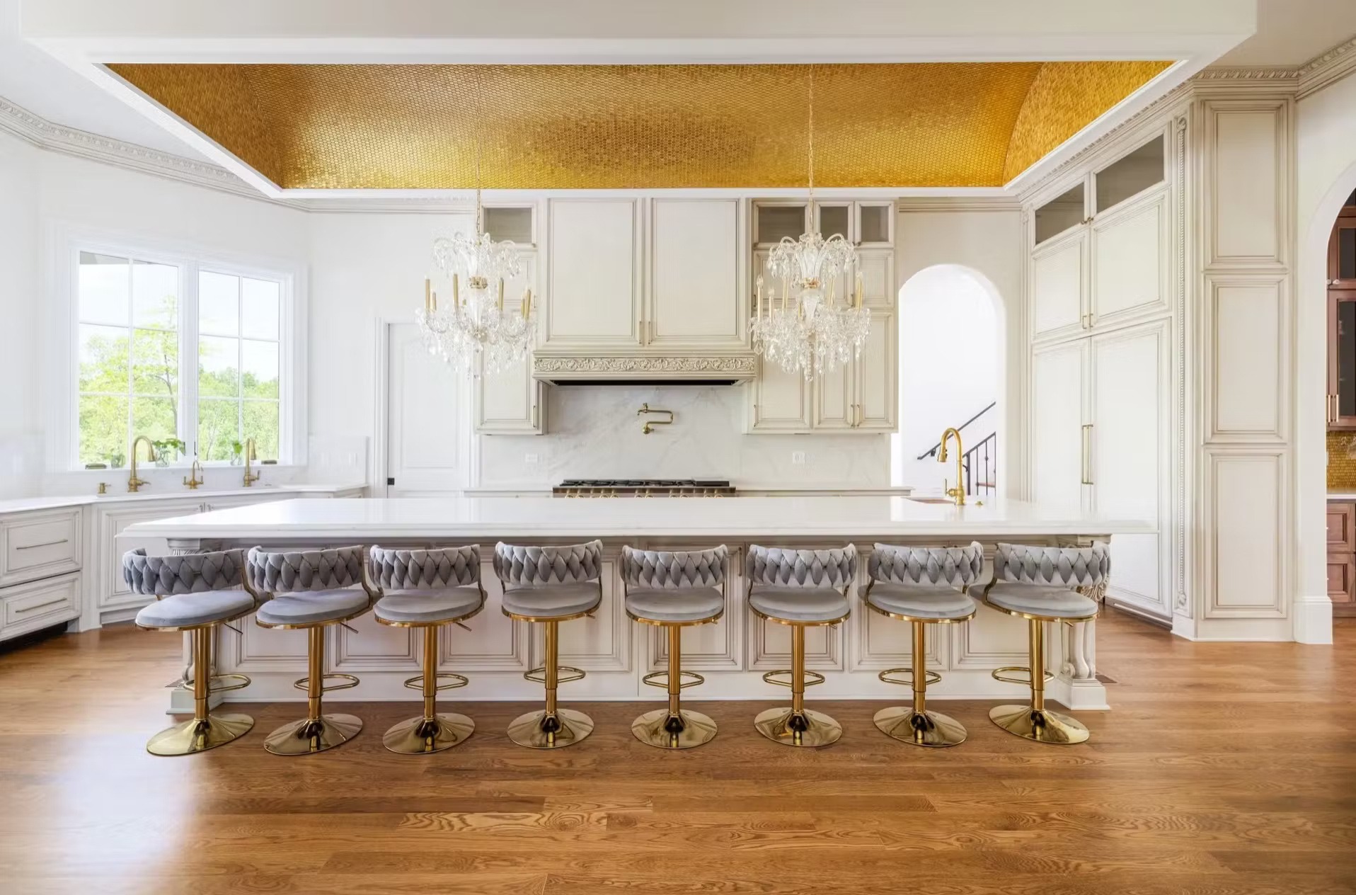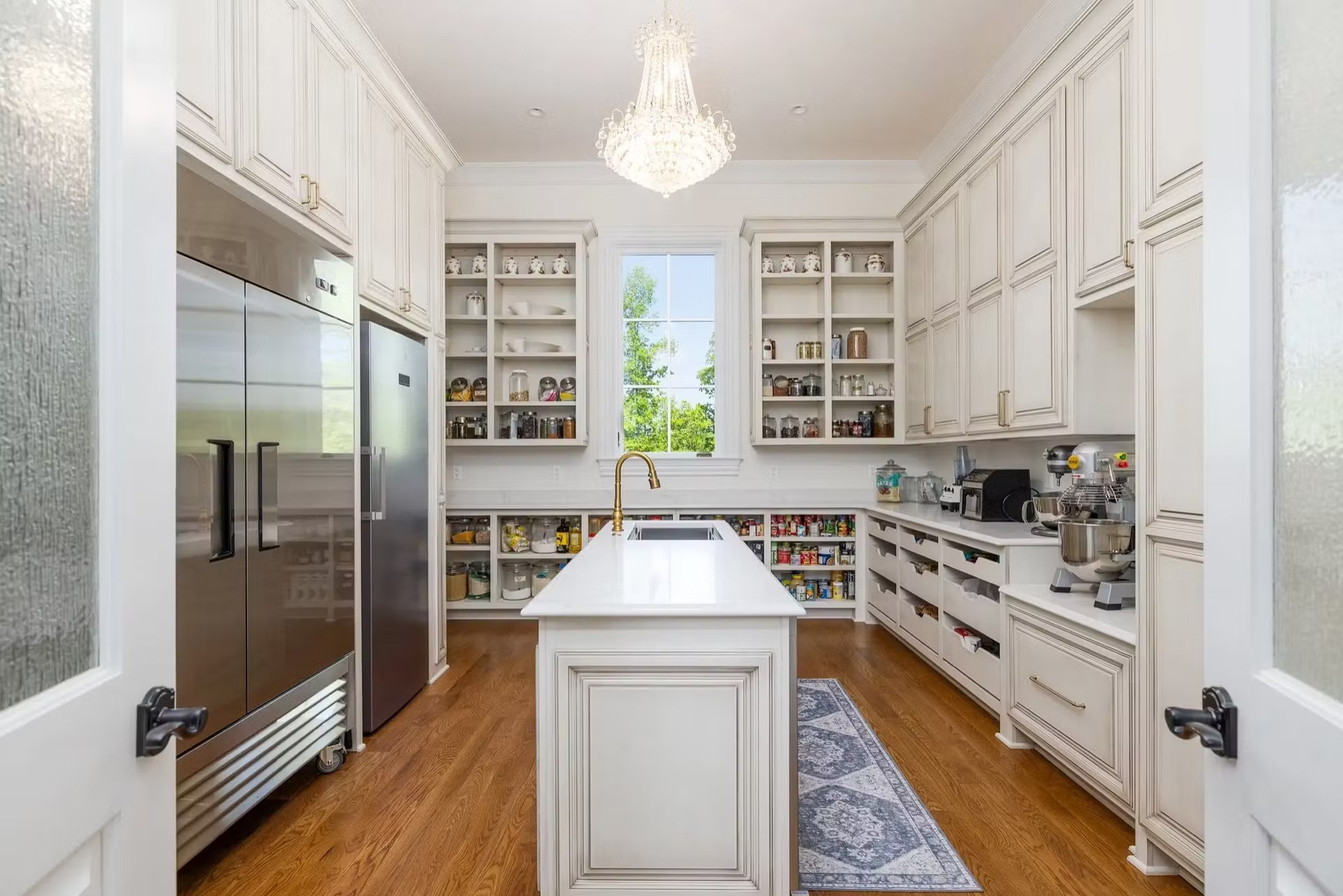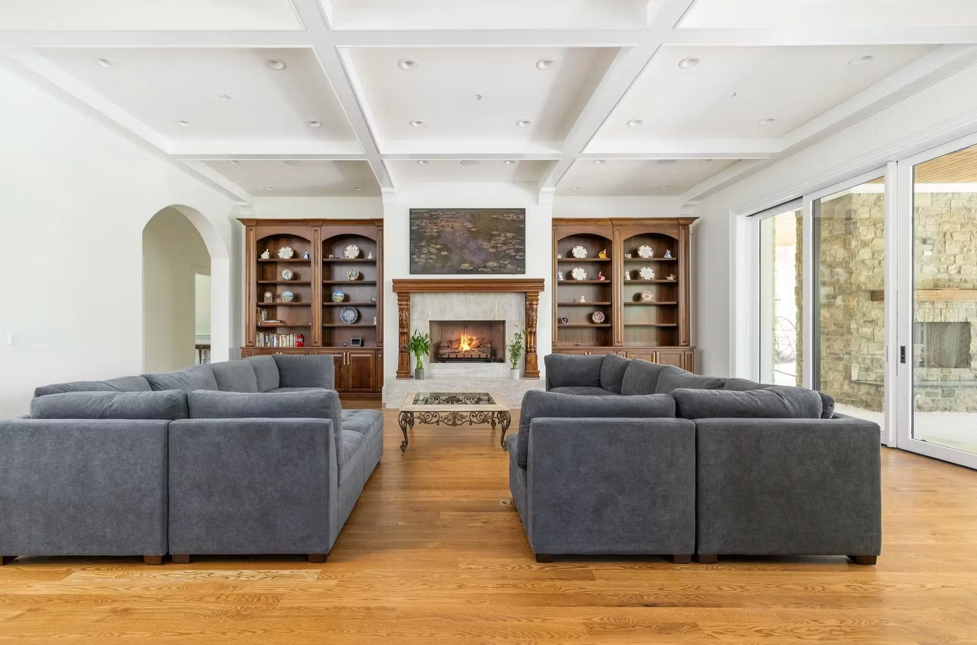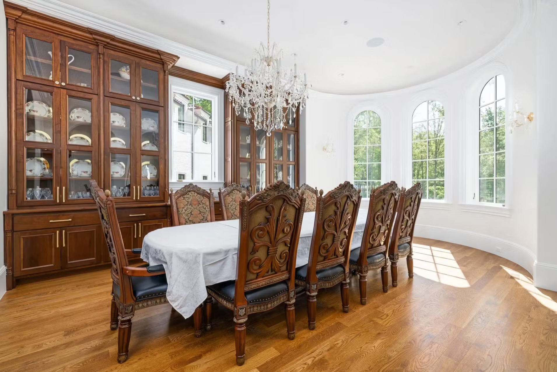 It features over 14,000 square feet of living space with 5 bedrooms, 7 full and 3 half bathrooms, elevator, living & dining rooms, kitchen, pantry, billiards room with wet bar, movie theater, wine cellar, gym, 5-car garage and more.