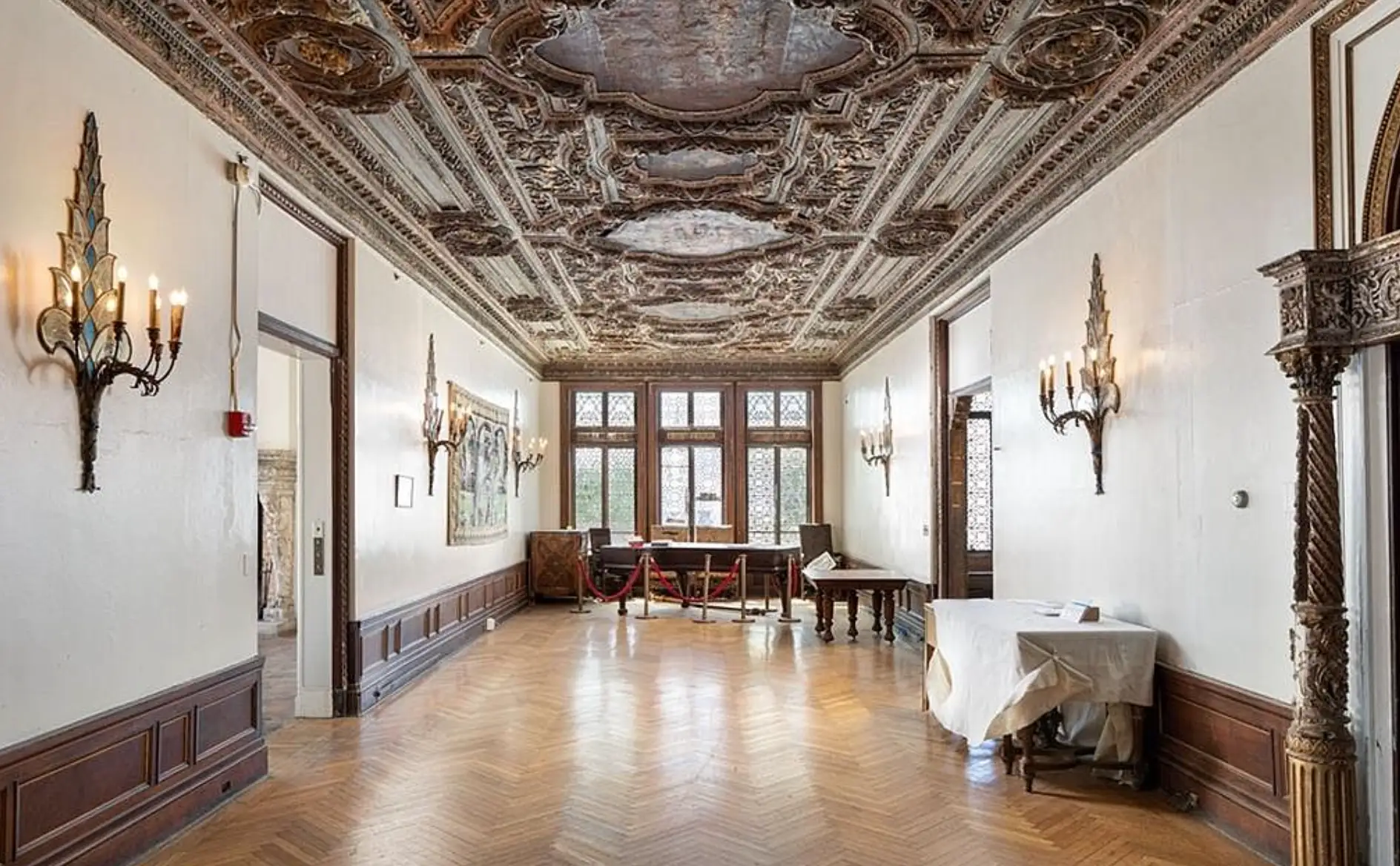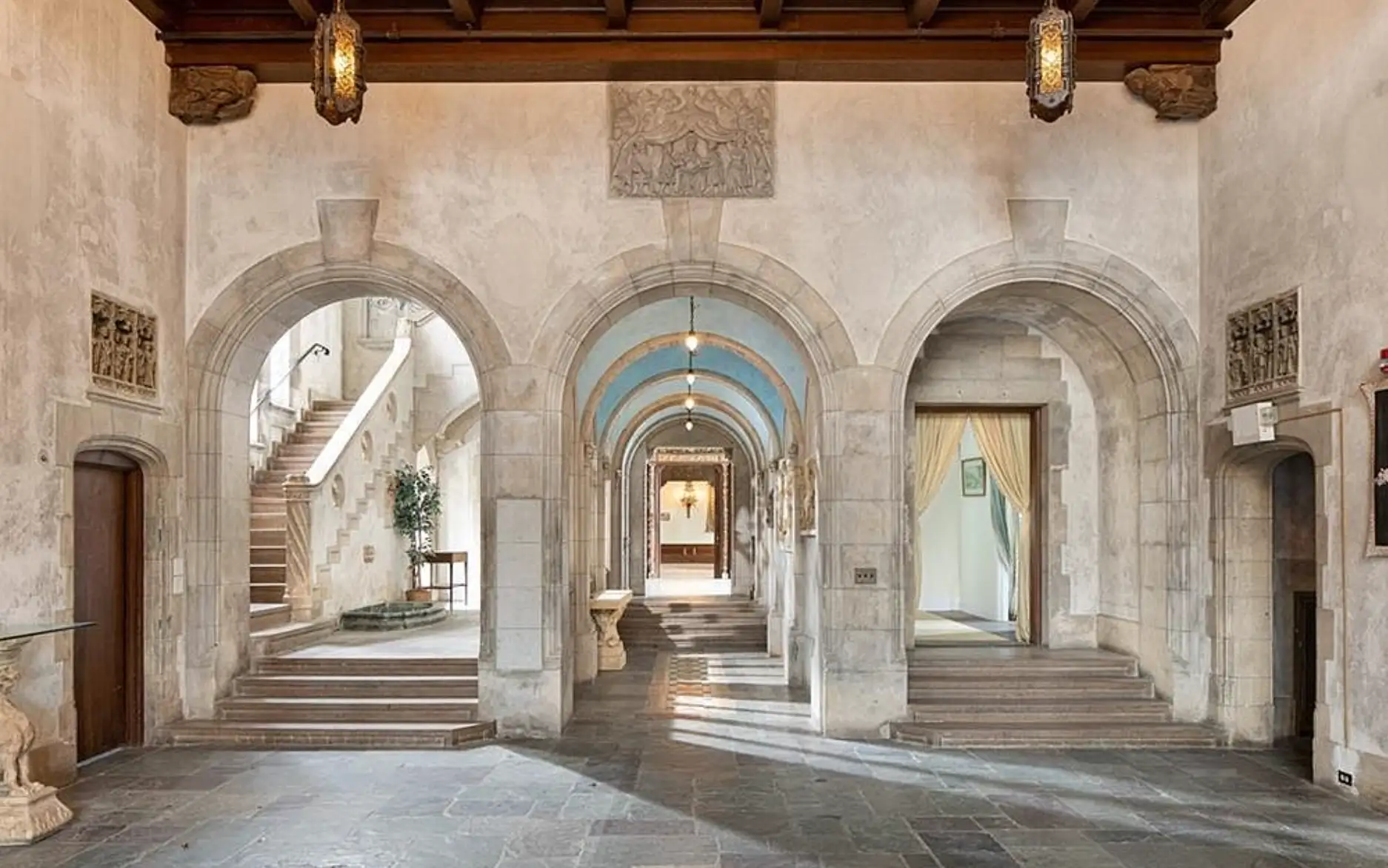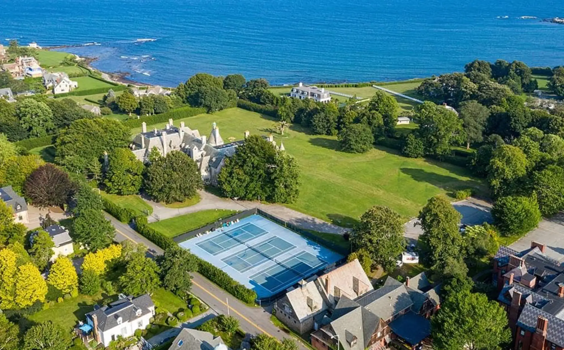 This historic mansion, dubbed “Seaview Terrace” (also known as the Carey Mansion), is located at 207 Ruggles Avenue in Newport, Rhode Island and is situated on over 7 acres of land. It is the fifth largest estate in Newport and the largest that remains privately owned. It was built in 1907 for Edson Bradley, who was the president of Kentucky whiskey distiller W.A. Gaines and Company of Frankfort, Kentucky.
