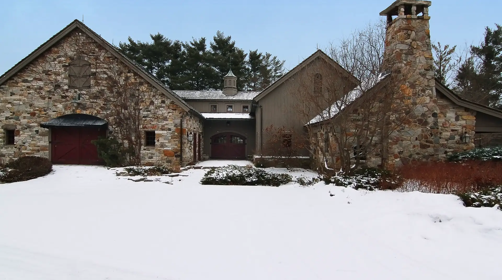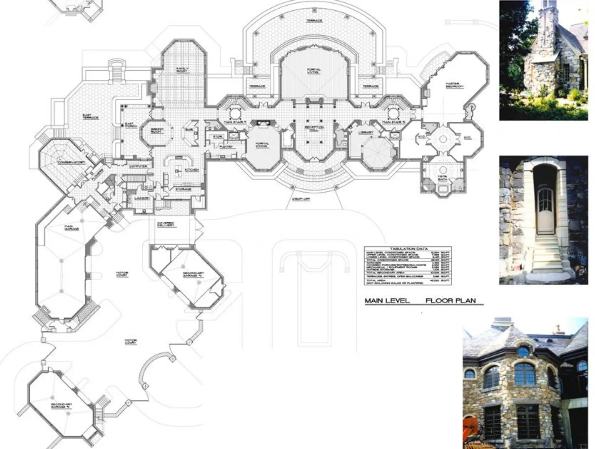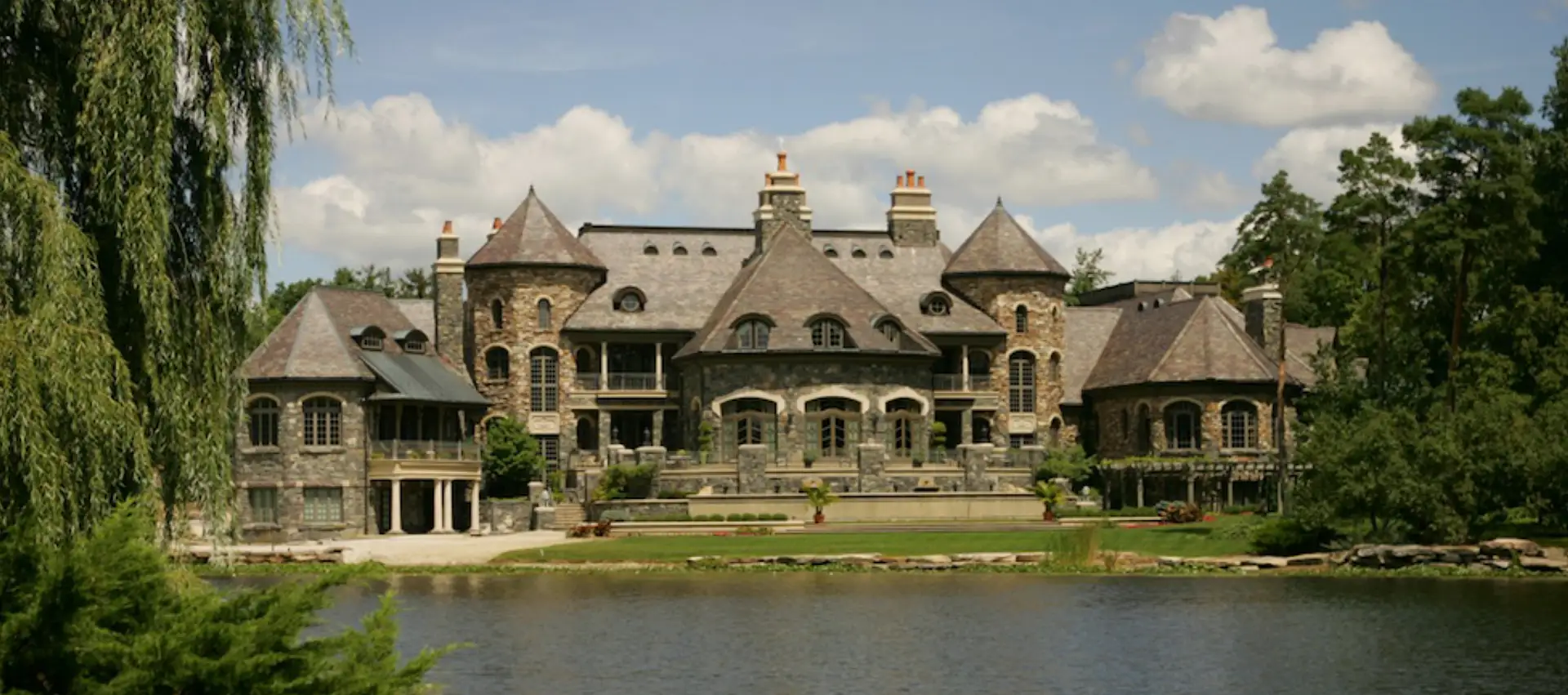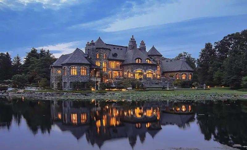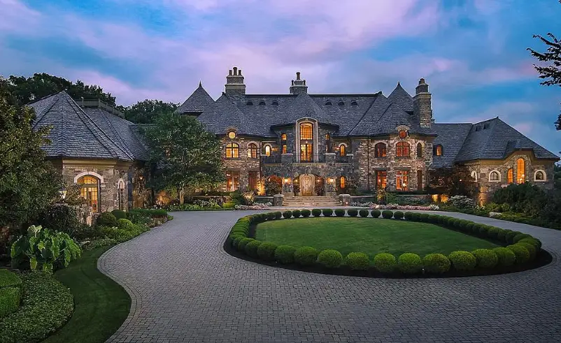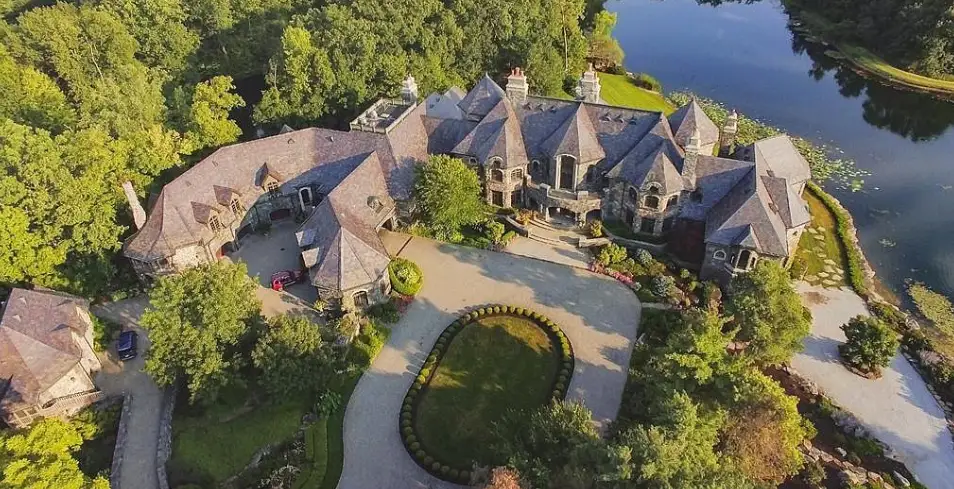 It boasts a main house, guest house and stable. The stone main home features over 29,000 square feet of living space with 8 bedrooms, 15 bathrooms, 2 elevators, formal living & dining rooms, gourmet kitchen, breakfast room, family room, 2-story paneled library, conservatory, game room, wine cellar, garage and much more.