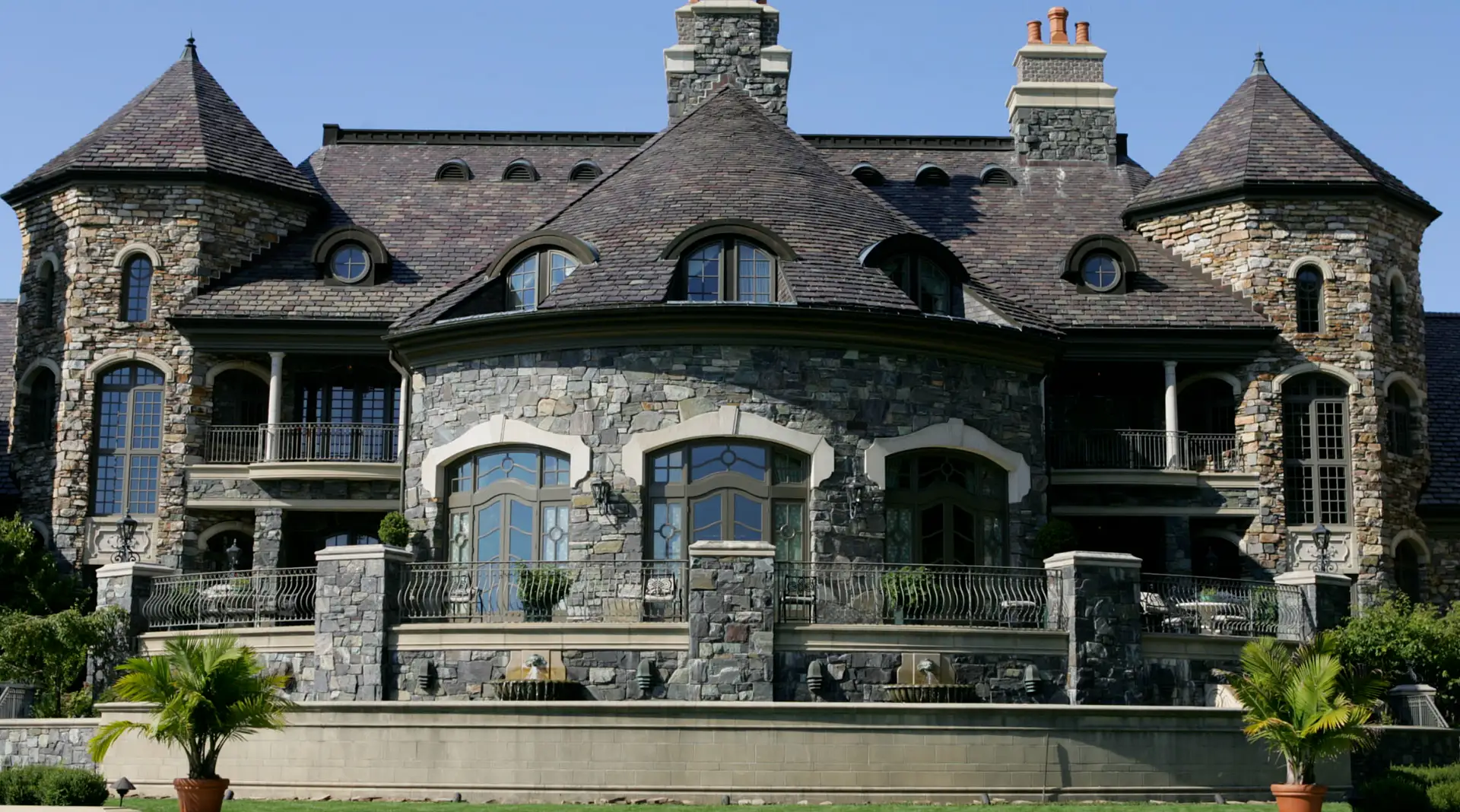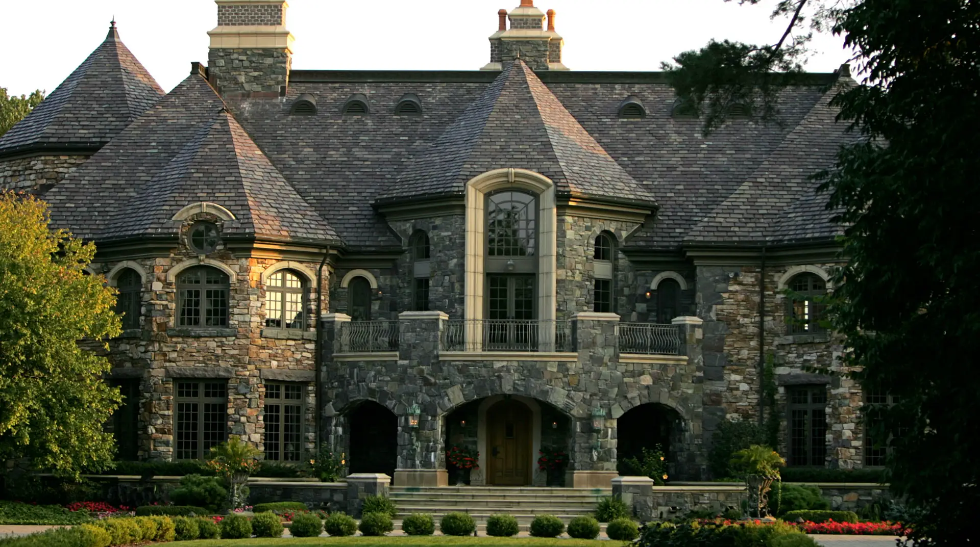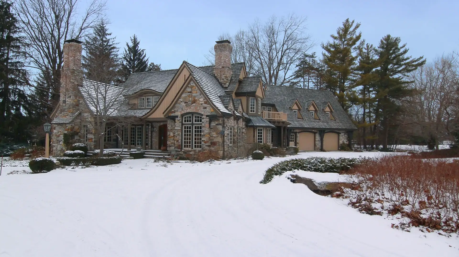 It boasts a main house, guest house and stable. The stone main home features over 29,000 square feet of living space with 8 bedrooms, 15 bathrooms, 2 elevators, formal living & dining rooms, gourmet kitchen, breakfast room, family room, 2-story paneled library, conservatory, game room, wine cellar, garage and much more.
