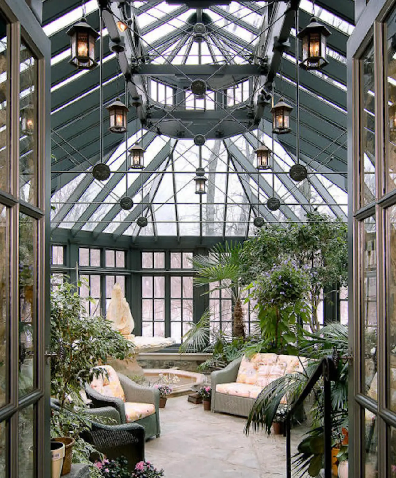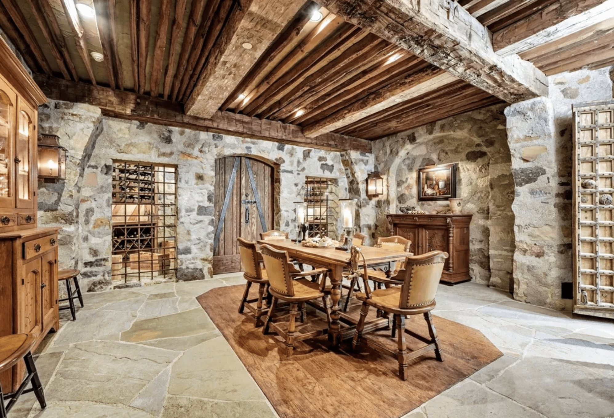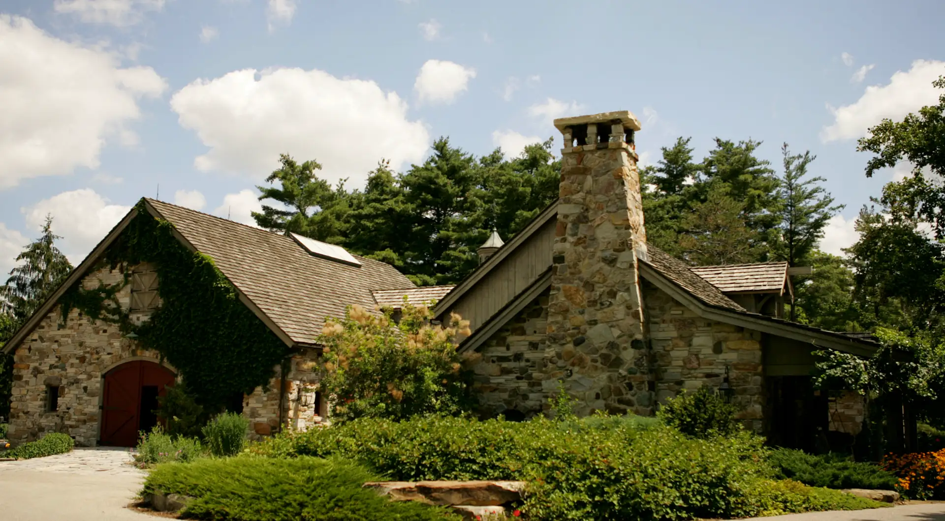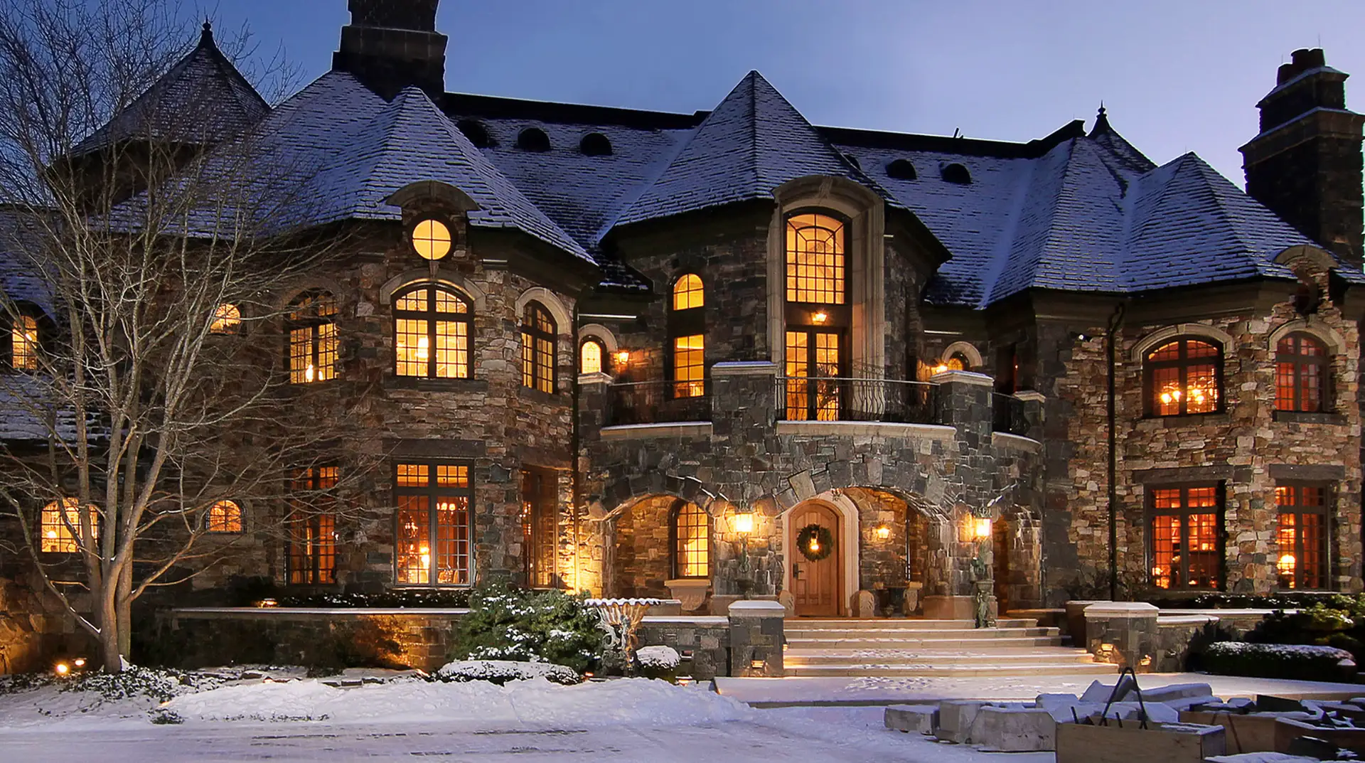 It boasts a main house, guest house and stable. The stone main home features over 29,000 square feet of living space with 8 bedrooms, 15 bathrooms, 2 elevators, formal living & dining rooms, gourmet kitchen, breakfast room, family room, 2-story paneled library, conservatory, game room, wine cellar, garage and much more.